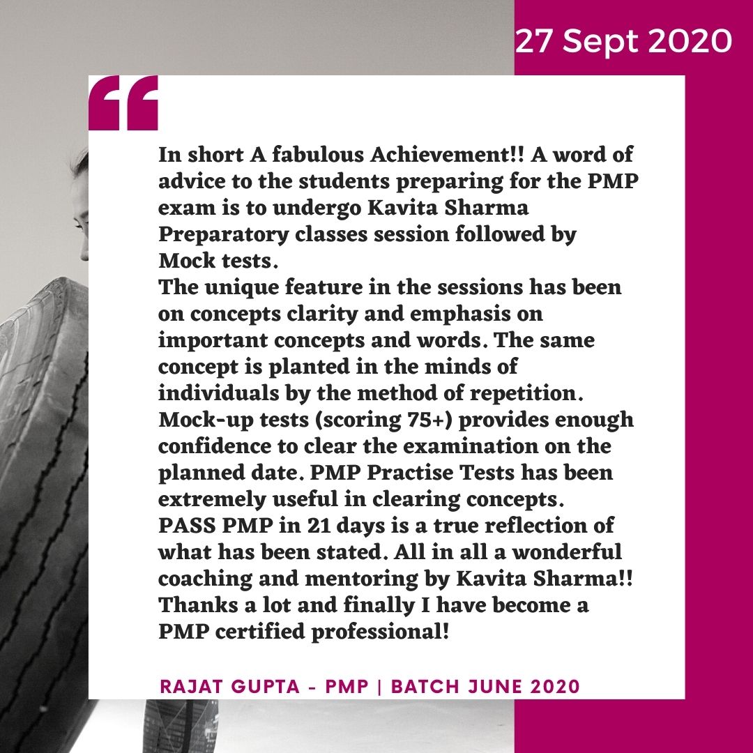 In short A fabulous Achievement!! A word of advice to the students preparing for the PMP exam is to undergo Kavita Sharma Preparatory classes session followed by Mock tests. The unique feature in the sessions has been on concepts clarity and emphasis on important concepts and words. The same concept is planted in the minds of individuals by the method of repetition. Mock-up tests (scoring 75+) provides enough confidence to clear the examination on the planned date. PMP Practise Tests has been extremely useful in clearing concepts. PASS PMP in 21 days is a true reflection of what has been stated. All in all a wonderful coaching and mentoring by Kavita Sharma!! Thanks a lot and finally I have become a PMP certified professional!