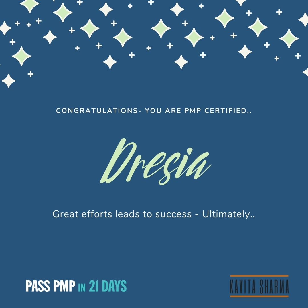 Dear Kavita,I want to thank you for your valuable training which has helped me a lot to pass the PMP after the 3th time. I wish I have had taken this course before. Even I attended a 4 day physical training it was not the same how you have presented the training with a study plan. I was not able to attend your live sessions but only one of them. Unfortunately I was too busy with my work with some challenging projects! However i am happy that you have recorded the training so i could start when the time was right. I have done your training in 14 days with 1 week off which enabled me to study every day for 6 a 8 hours. Your approach to help people to pass the exam is fabulous, thank you so much for that again :) .Kind regards,Dresia
