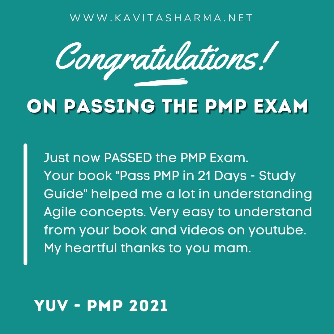 Your book "Pass PMP in 21 Days - Study Guide" helped me a lot in understanding Agile concepts. Very easy to understand from your book and videos on youtube.