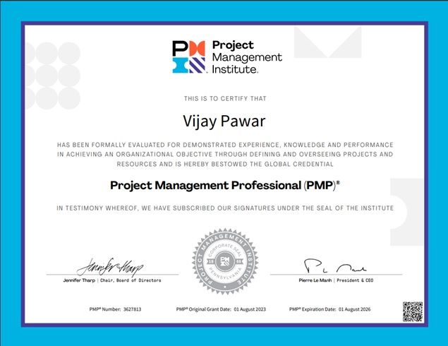 Congratulations Vijay on passing the PMP exam! Your hard work, dedication, and determination have paid off, and you've achieved a significant milestone in your professional career. Well done on earning the prestigious PMP certification – your commitment to excellence is truly admirable. Best wishes for continued success in all your future endeavors!